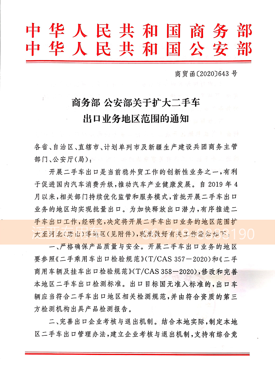 经济日报12月1日报道: 中国商务部、公安部近日联合印发通知,进一步扩大开展二手车出口业务的地区范围。