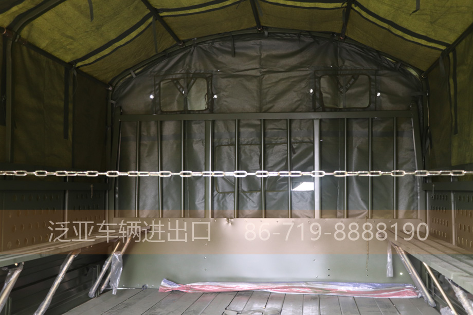 车上装有冷启动系统、副油箱、机油桶、水桶、篷布篷杆、工具箱等军用附加装置,可在-41℃环境温度下能顺利启动
