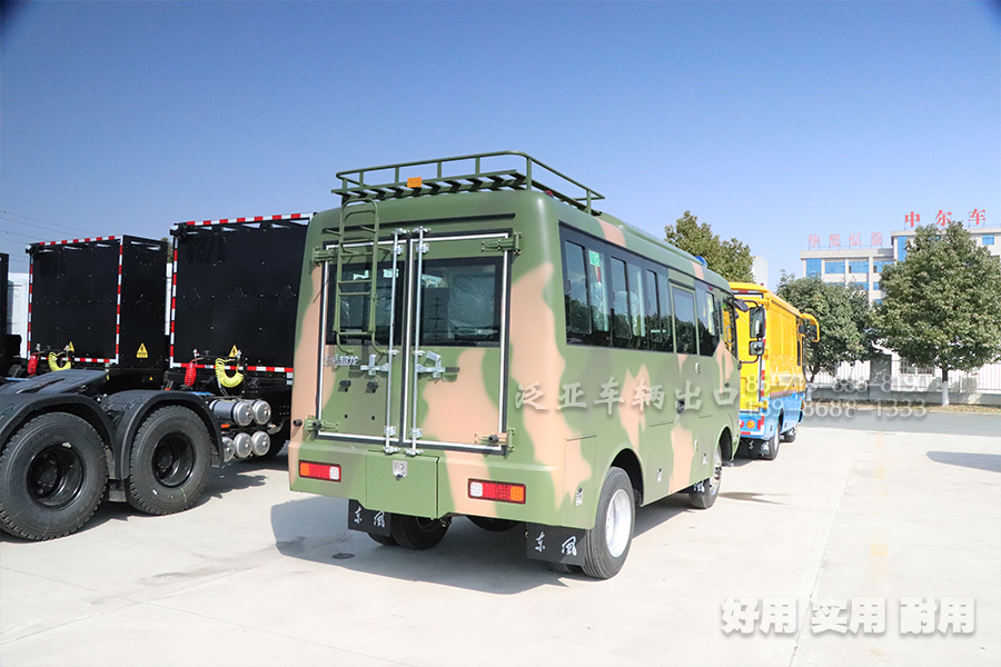 东风全地形四驱越野客车是公司自主开发的越野客车,具有性能强、动力好的特点,采用分时4×4驱动,离地面高度的优势,使该车型在野外及低等道路的能行能力强,且具有很好的爬坡能力,通行坡度60%,运载能力强,载客人数17人、19人、23人、29人可以选择,车身前围部分及仪表台借用东风EQ153驾驶室,提高了整车零部件的通用性,底盘稳固、扎实,发动机动力强劲,内饰豪华、舒适、安全。