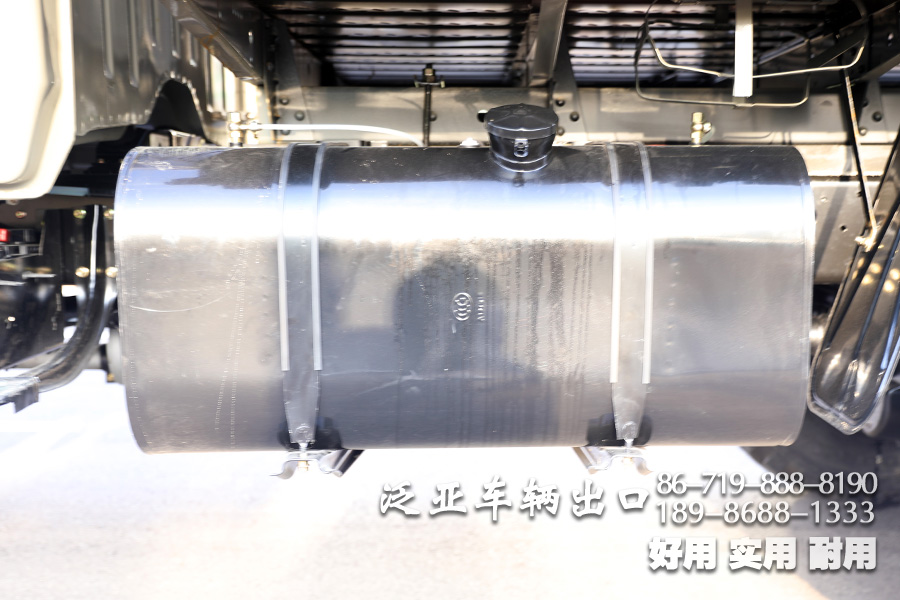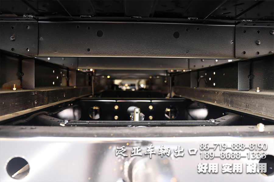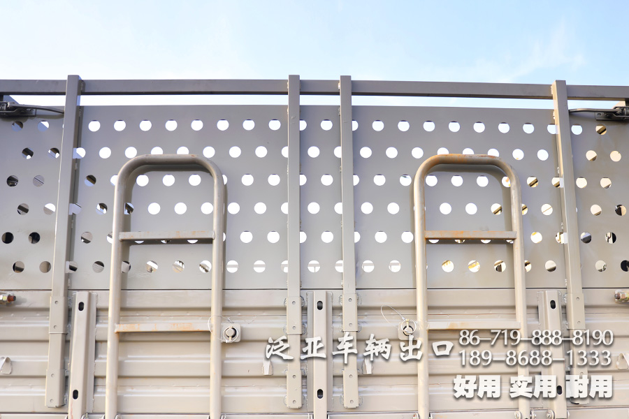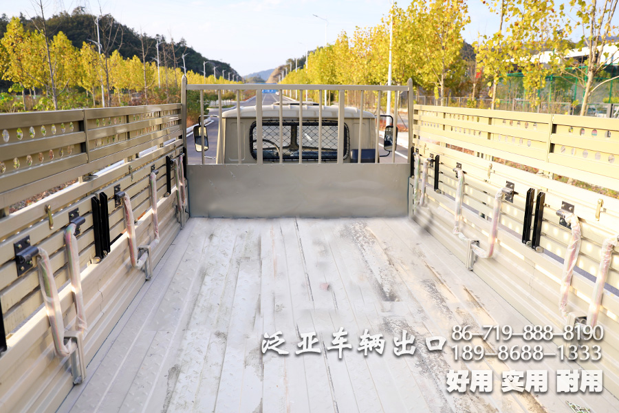 货箱底板采用纯铁材质,带有防滑花纹。两侧边板安装有折叠座椅,货箱内部装有固定链条,尾部带有2个折叠爬梯。蓬布篷杆可拆卸,在风沙暴雨天气下,可以有效的保护货箱内的人员和物资。