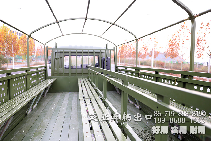 车上装有冷启动系统、副油箱、机油桶、水桶、篷布篷杆、工具箱等军用附加装置,可在-41℃环境温度下能顺利启动;可选装绞盘。