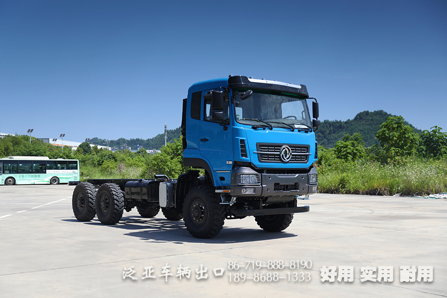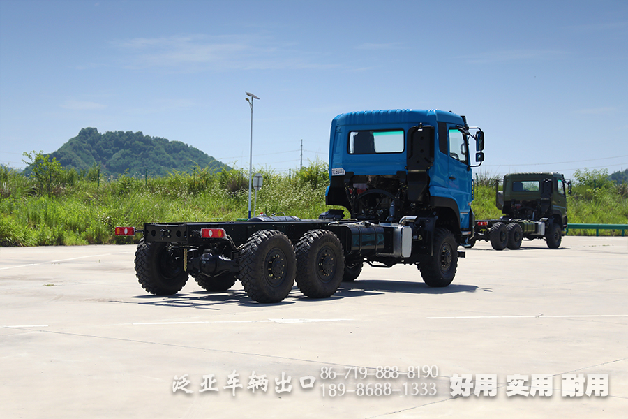 6x6东风重型专用车底盘,总质量可达25吨,六轮驱动使得它可以在山路、森林等地区行驶,适合改装成载货卡车、自卸汽车、混凝土搅拌车等专用重型车。