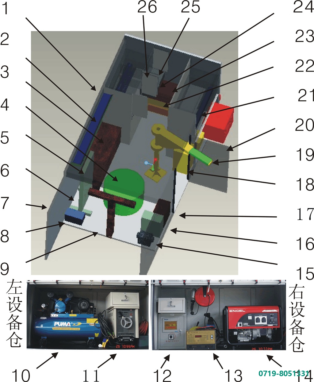 1.窗户  2 .行李仓  3.桌凳  4.大工件  5. 压力机  6.硬连接  7.后门  8.虎钳  9.拖举  10.空压机  11.电焊机  12.配电柜  13.充电机  14.发电机  15.砂轮机  16.台钻  17. 喷油试验器  18.饮水器  19.吊  20.右侧门  21.卷闸门  22.低位运输车  23.千斤顶  24.指挥箱  25.抽屉  26.工具柜